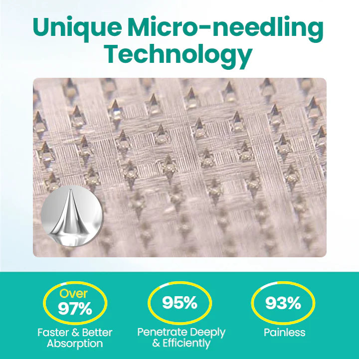Newyuo® LegRenew Patch uses a revolutionary microneedle delivery system — tiny, painless needles that gently penetrate your skin to deliver healing ingredients exactly where they’re needed: deep inside your veins and surrounding tissues.